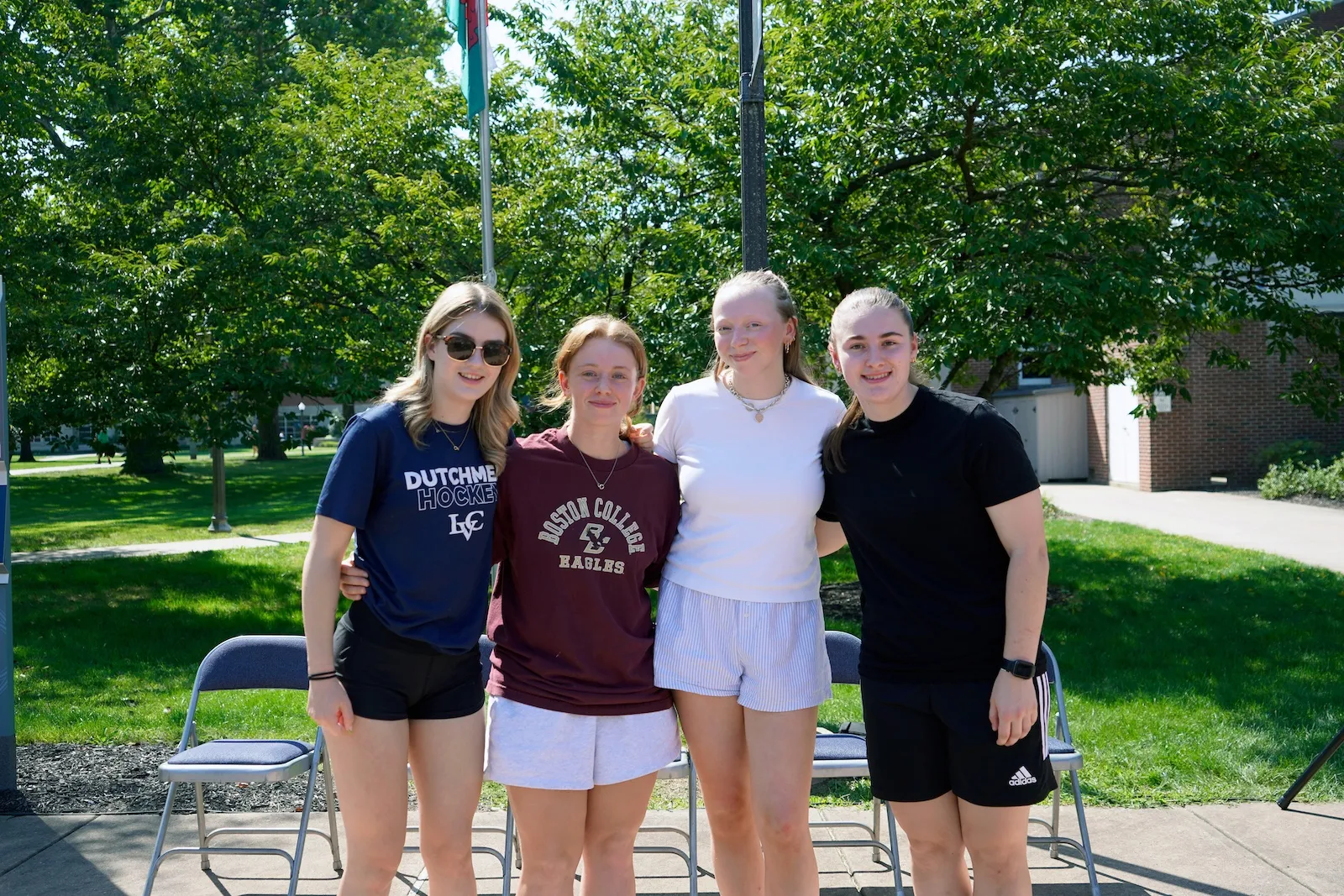 International Student Flag Raising August 2024. L-R: Madisyn Olson, Julianne Barrette, Georgia McPoland, Rhiannon Price