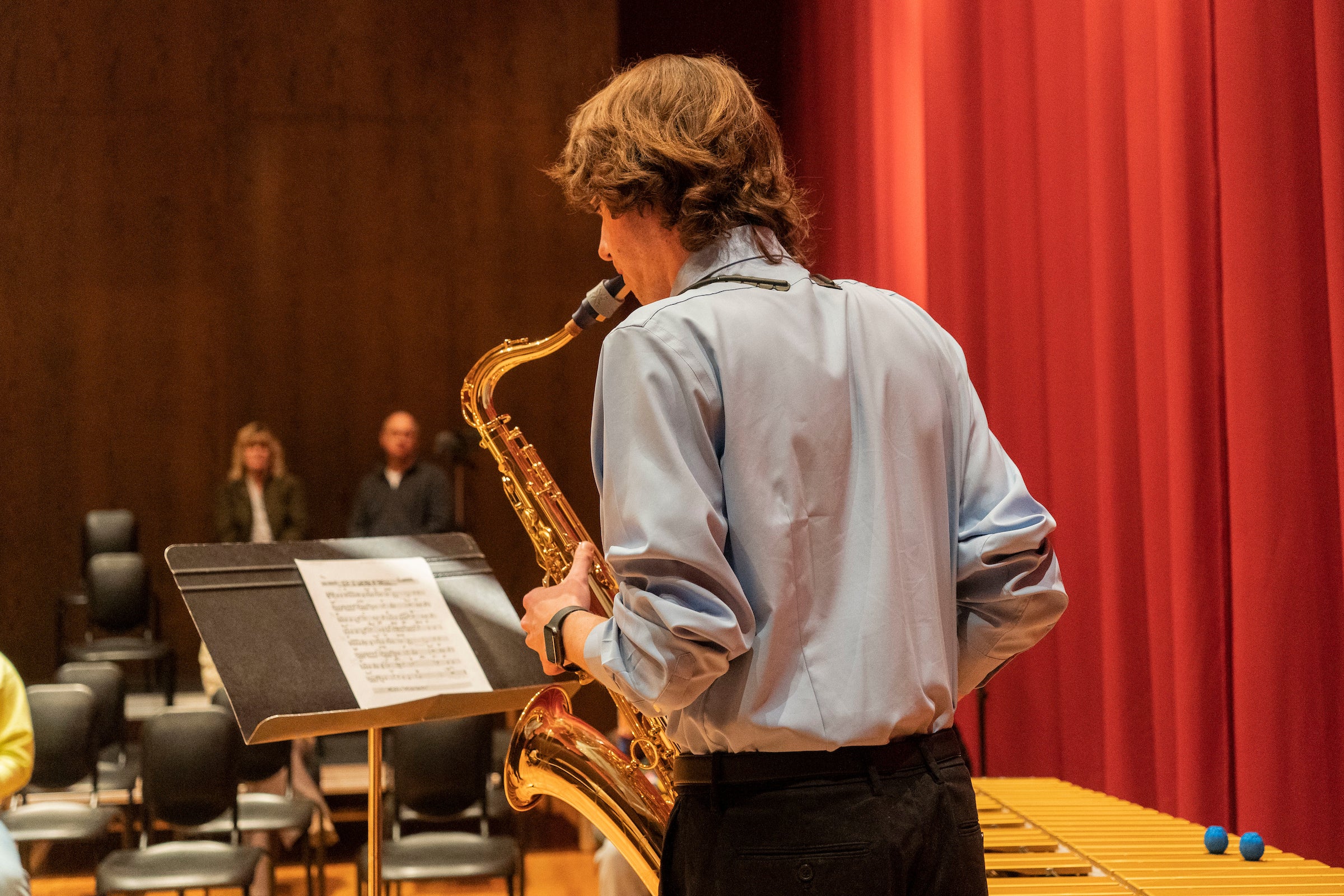 Student plays saxophone during common hour jazz performance