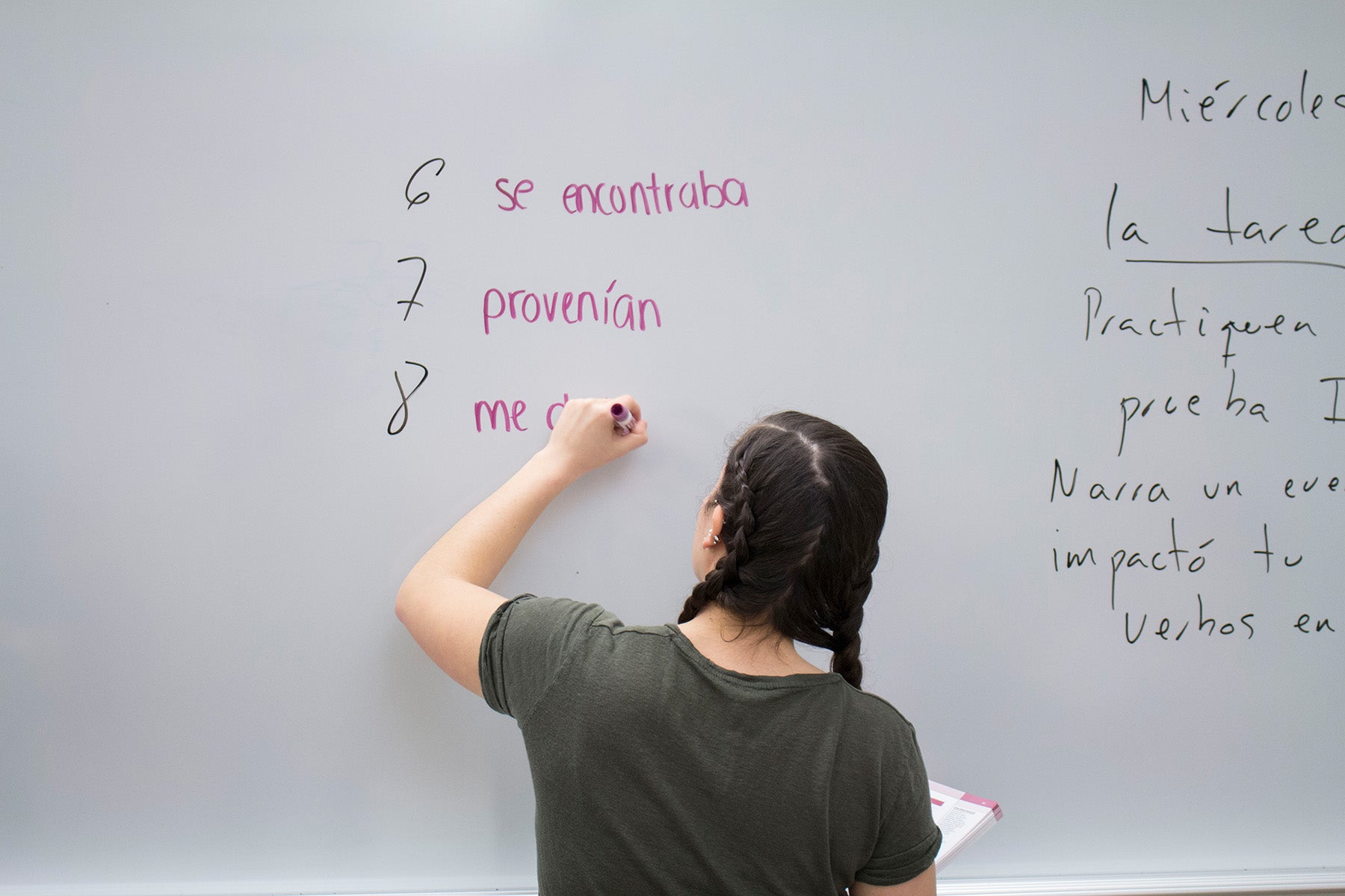 Student writing spanish words on whiteboard